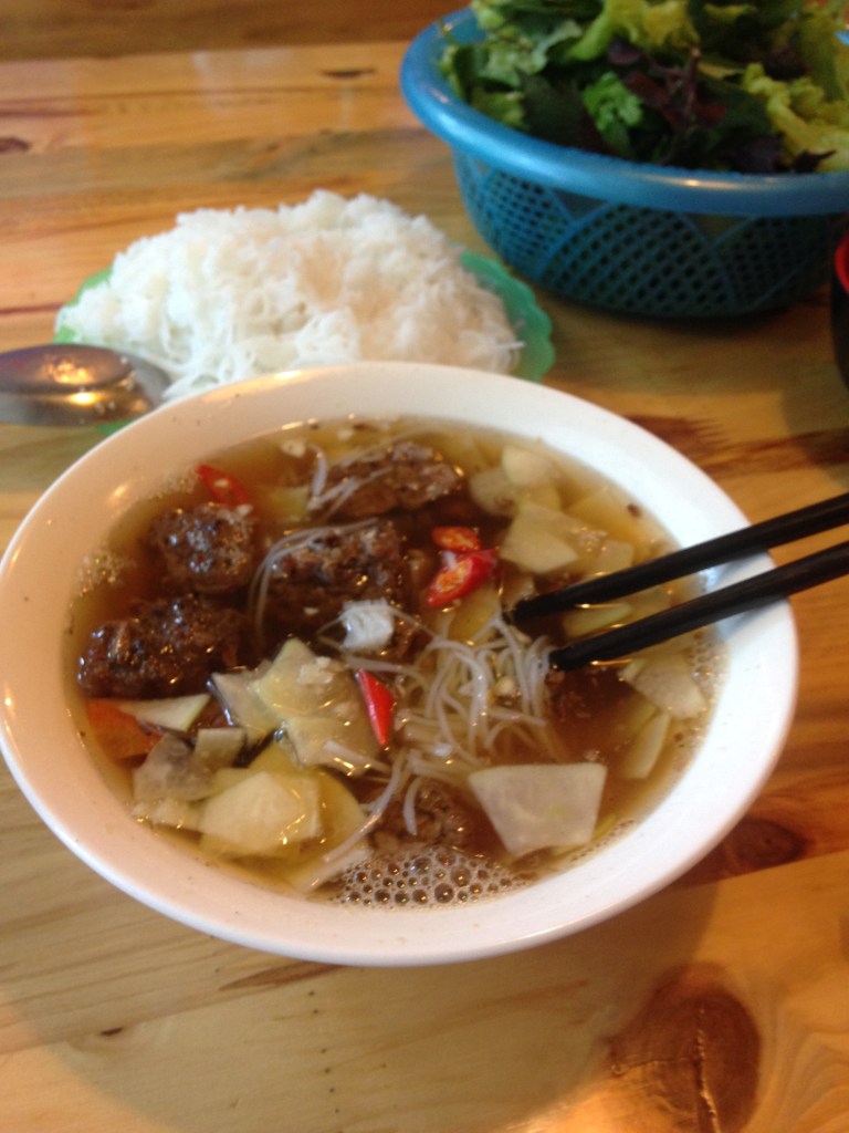 We were recommended Bun Cha by a friend in Hanoi, this simple lunchtime dish is a sweet pork based soup. It is usually served, like pho, with herbs, salad, chilli, garlic and also noodles on the side for you to add to taste. Like Pho is is addictive. We found ourselves being a little too liberal with our garlic servings and finding it hard to talk to (or breathe in the general direction) of other people for a while.